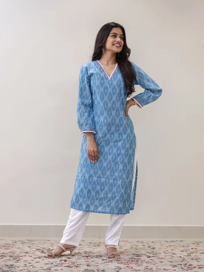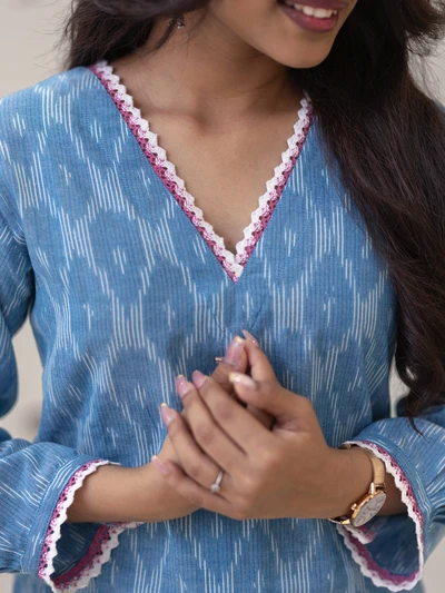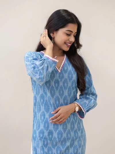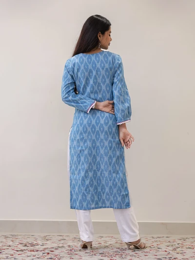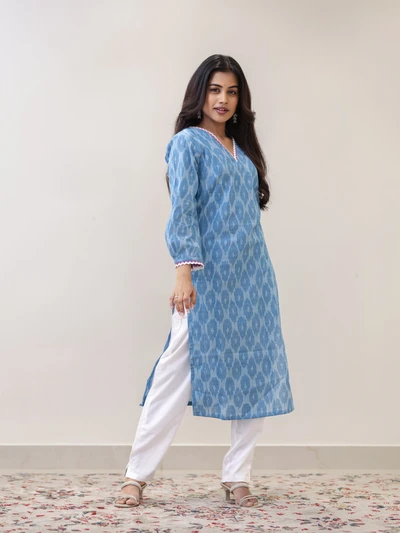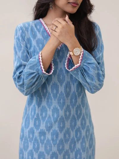 Frosted Vanilla Blue Ikat Handwoven Kurta