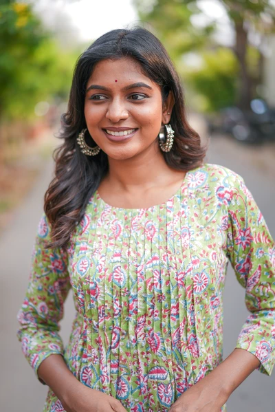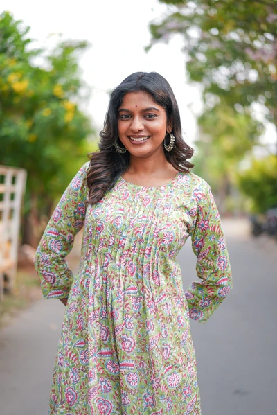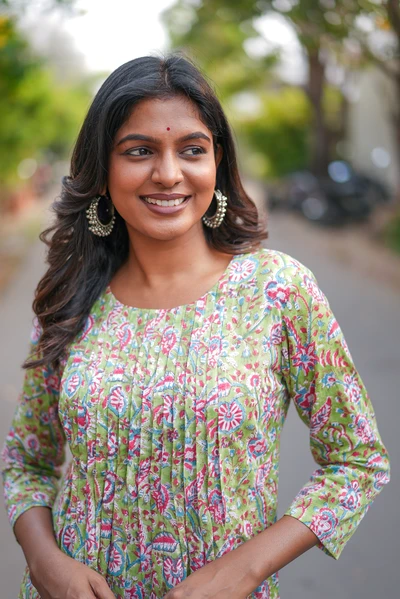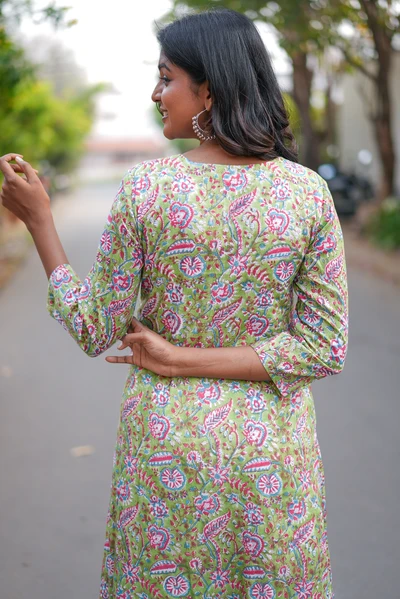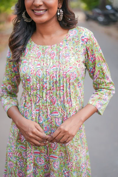 Pista Green Floral Handblock A-Line Kurta