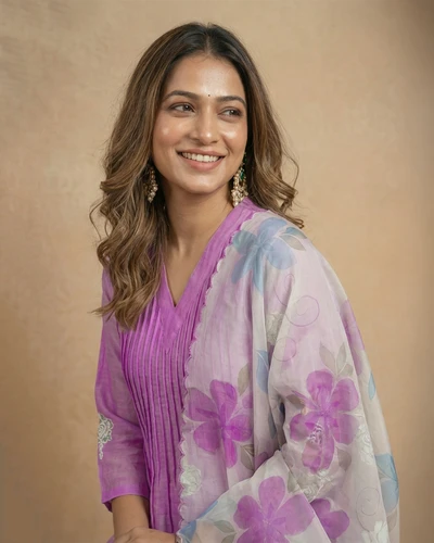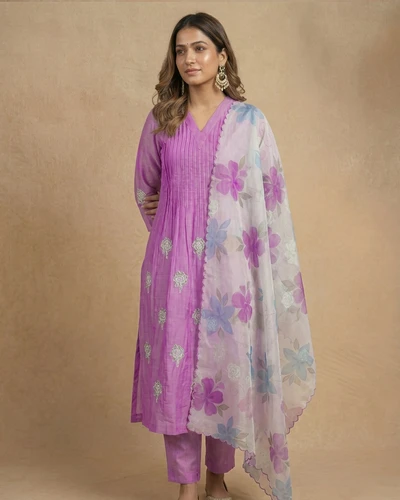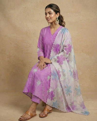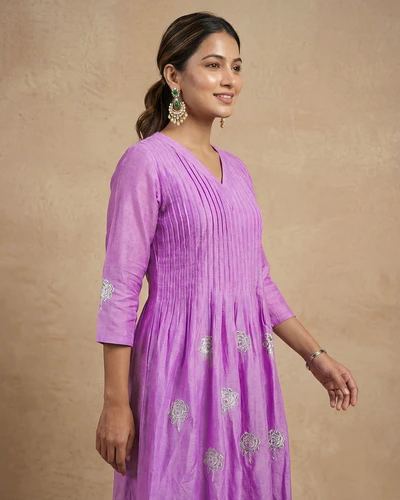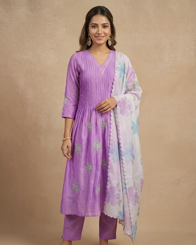 Lavender Leaf Embroidered Chanderi Kurta Set With Dupatta