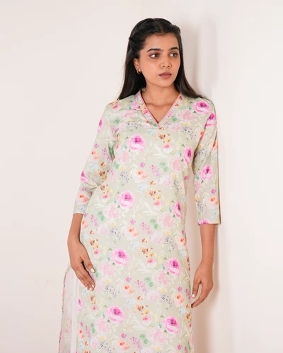 Lemon Green linen Floral Kurta