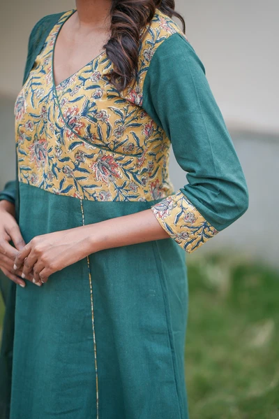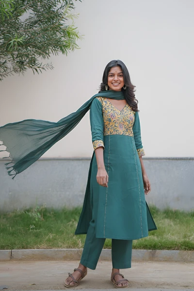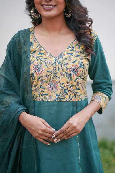 Peacock Green Kalamkari A-Line Co-ord Set With Dupatta