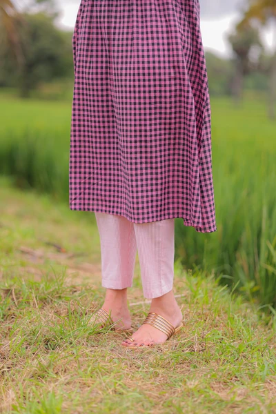 Rani Pink Check Chungidi With Peacock Border A-Line Kurta Set With Dupatta