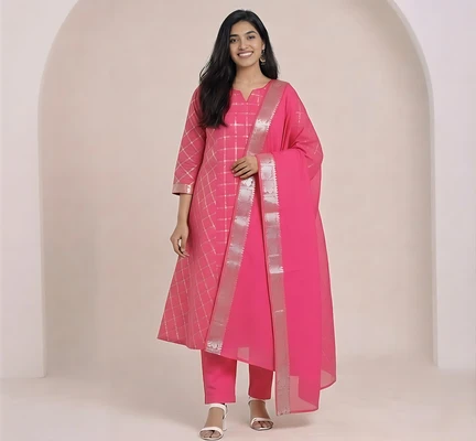 Rani Pink Check Chungidi With Peacock Border A-Line Kurta Set With Dupatta