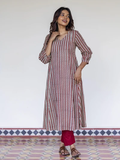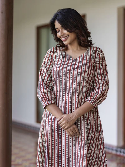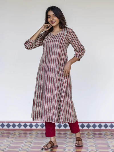 Terracotta Striped Handblock A-Line Kurta